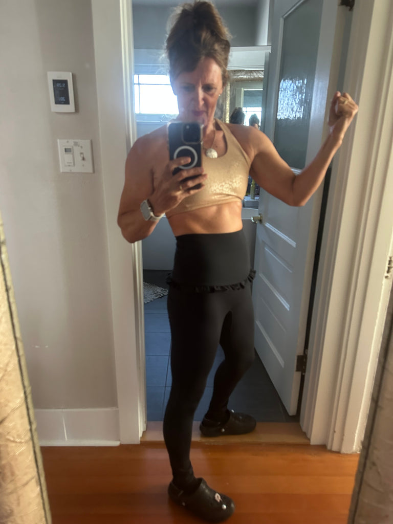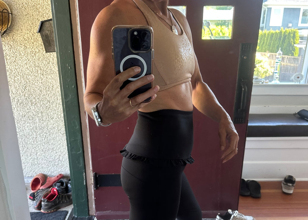 These leggings are beautiful! The wide waistband without elastic is flattering and comfortable on the tummy area. They are high rise which I personally love. We added an extra panel to the bum area which creates a 'lifting' effect. The back ruffle adds a feminine touch to a beautiful pair of leggings. Wear them to the gym or CrossFit , or hiking with friends!